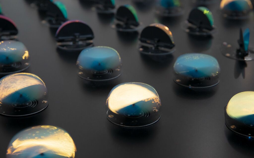 This interactive installation features kinetic modules that rotate in response to light, revealing iridescent surfaces. A hexagonal structure and constant light source create a play of shadows that triggers movement, resulting in a dynamic, hypnotic visual experience.