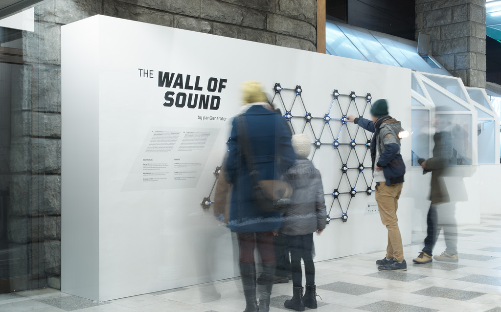 The installation brings electronic music tools into public space, letting people record and play sound through hexagonal modules. Its graffiti-inspired design adds light, sound, and interaction. The piece evolves with each new voice added.