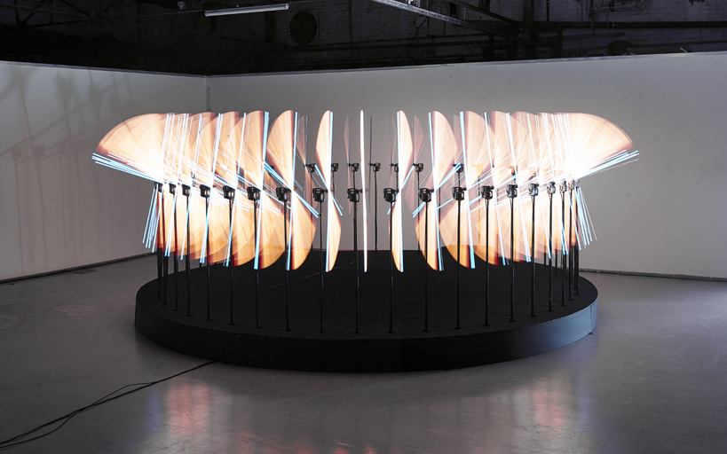 The installation is composed of ten LED holographic displays lined in a row, one behind the other, creating a three-dimensional image that visually displays variations of sound.